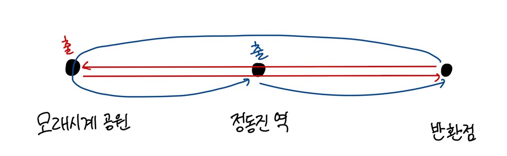 모래시계 공원 출발이면 일직선으로 쭉 왔다가 이제 반 돌아가면 코스 끝이고